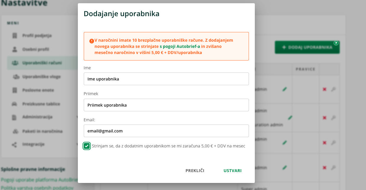 Sistem te bo pred potrditvijo opozoril ali izbrani paket omogoča dodajanje uporabnikov in ali je potreben nakup dodatnega uporabniškega mesta.