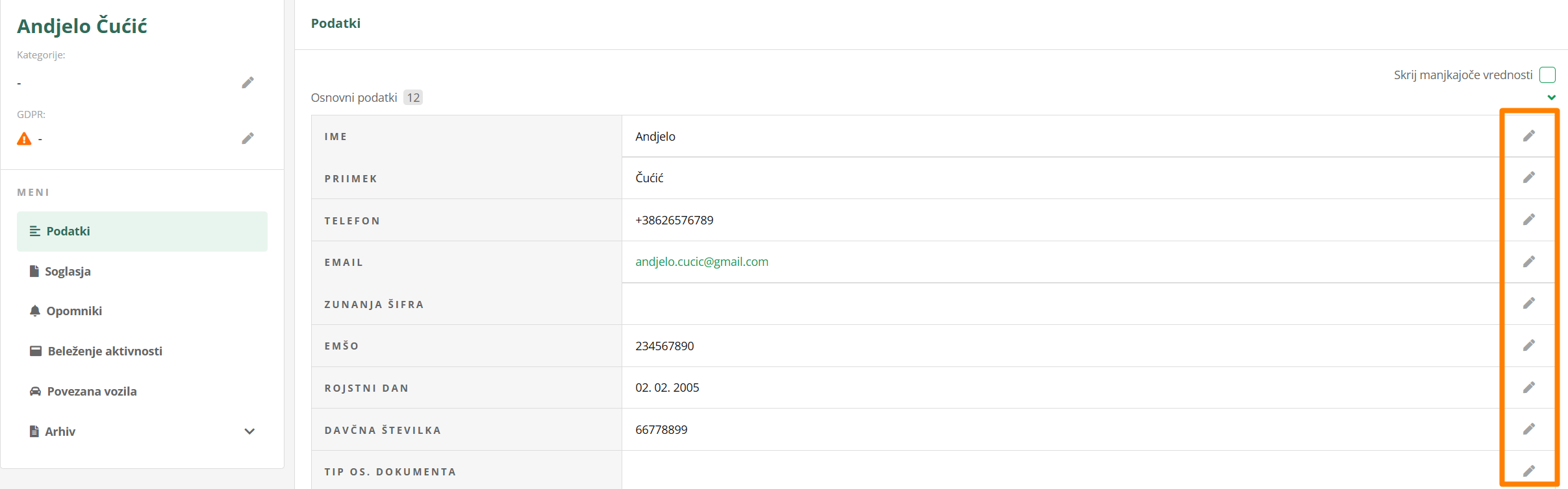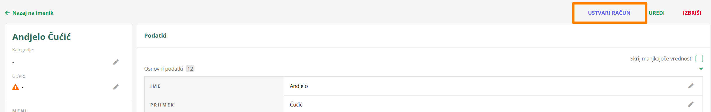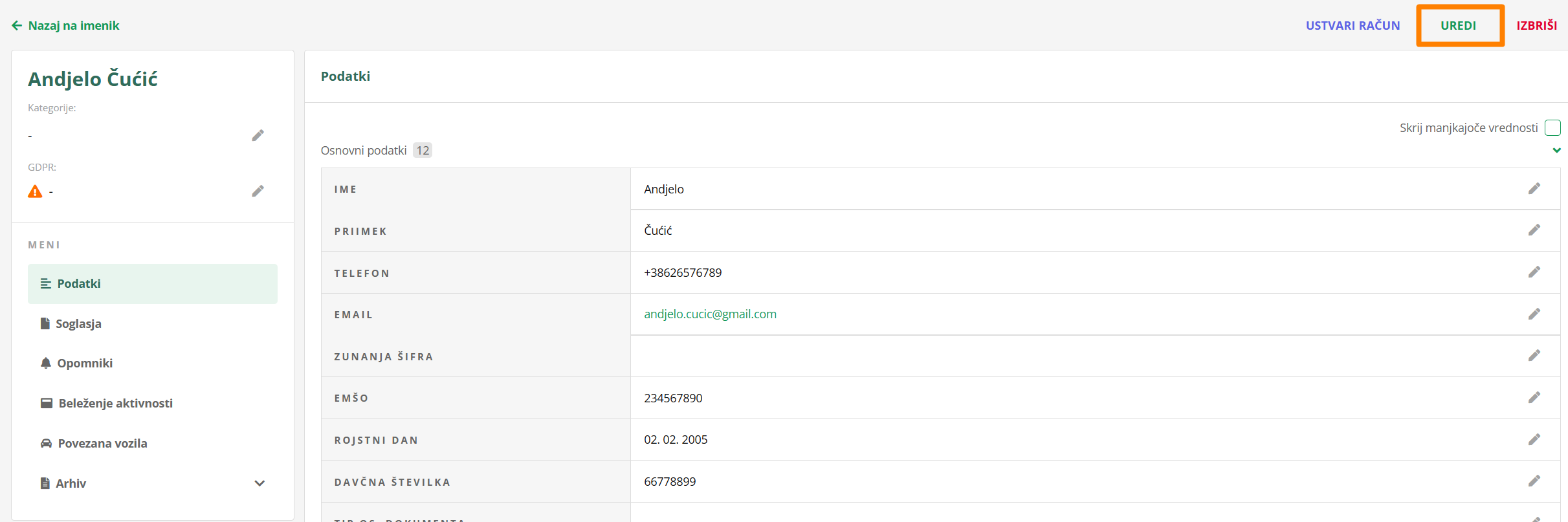 Drugi način, ki pa ti omogoči urejanje vseh podatkov naenkrat, pa je s klikom na UREDI v zgornji vrstici.
