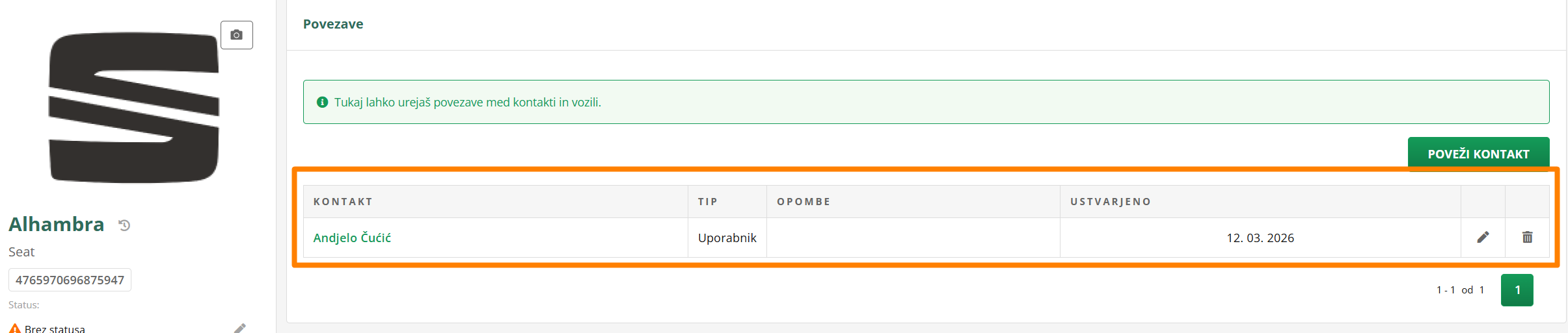 Kontakt pa se prikaže tudi na kartici vozila med Povezanimi kontakti.