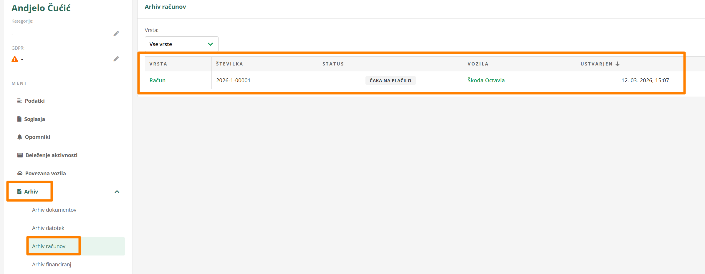 Račun se shrani tudi na kartico kontakta pod razdelek Arhiv>Arhiv računov, kjer ti je vedno na voljo. Enako velja tudi za vse ostale vrste računov, predračunov, avansov in dobropisov.