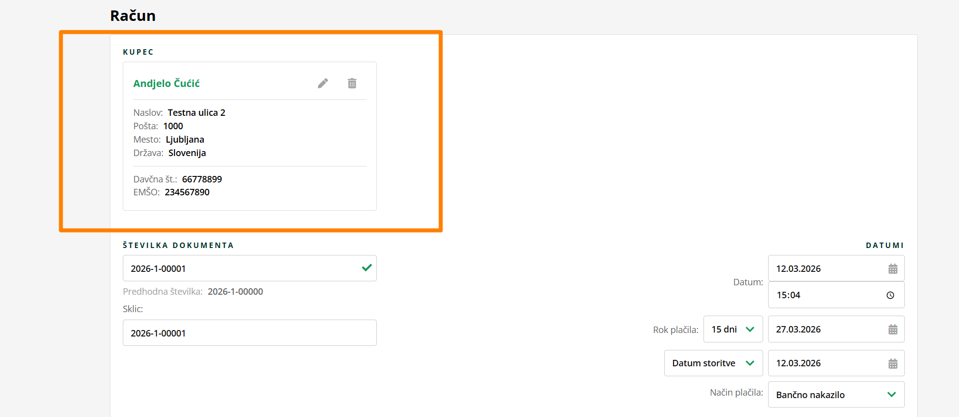 Ko klikneš na RAČUN, se ti odpre forma računa, pri kateri ne potrebuješ vpisovati podatkov o kupcu, ker se ti le-ti popolnijo direktno iz kontakta.