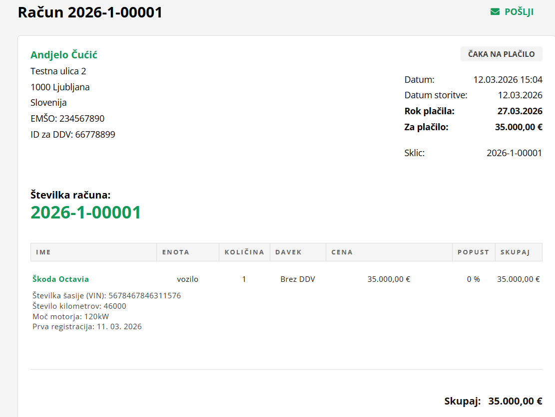 Vse kar potrebuješ je le, da izbereš postavko - vozilo ali storitev - ter ceno vozila. Izbereš še kakšno izmed klavzul in klikneš SHRANI. Izdal si račun z vsemi podatki.