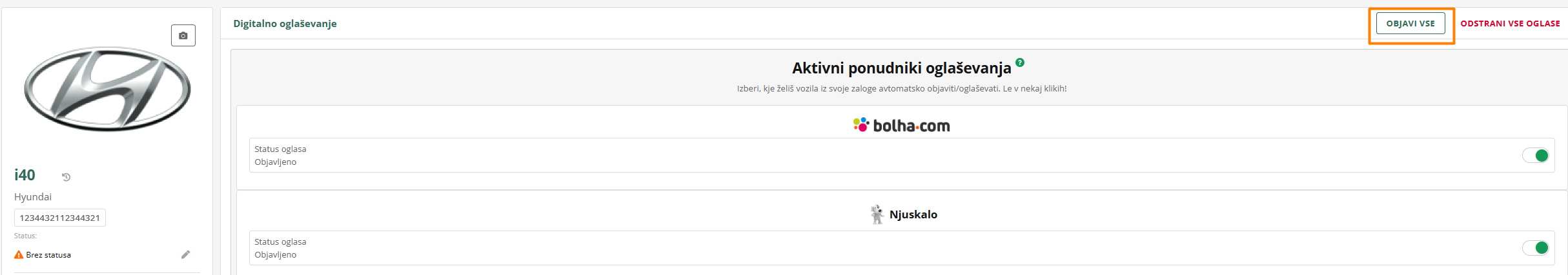 - Zgoraj desno se ti prikaže gumb OBJAVI VSE. S klikom nanj boš objavil oglas na vsa tista mesta, kjer vozila še nimaš.