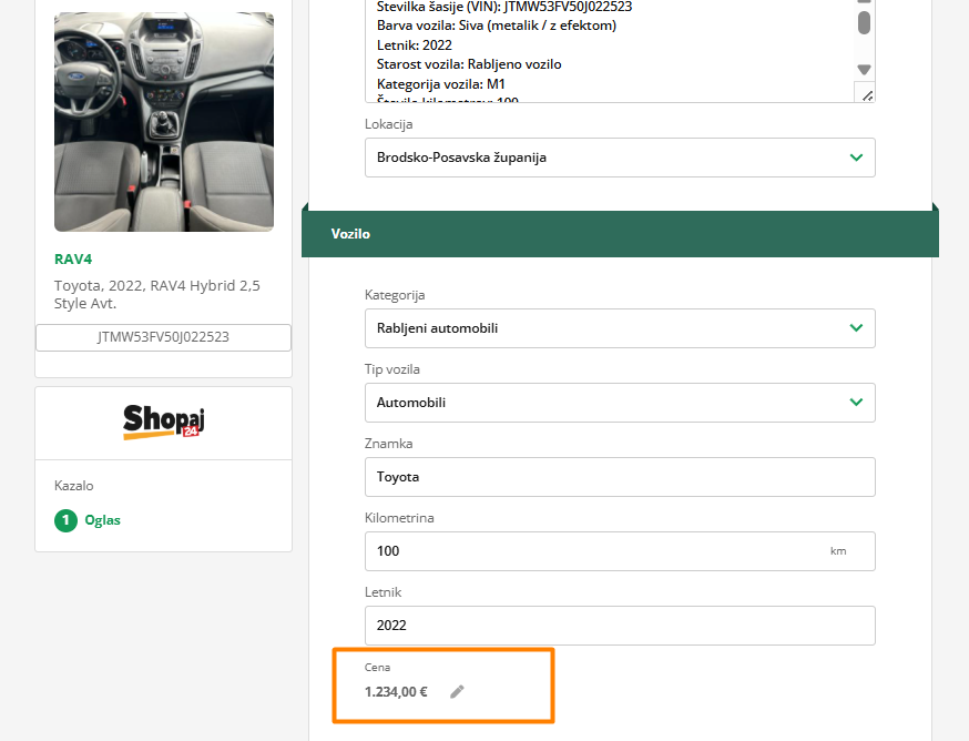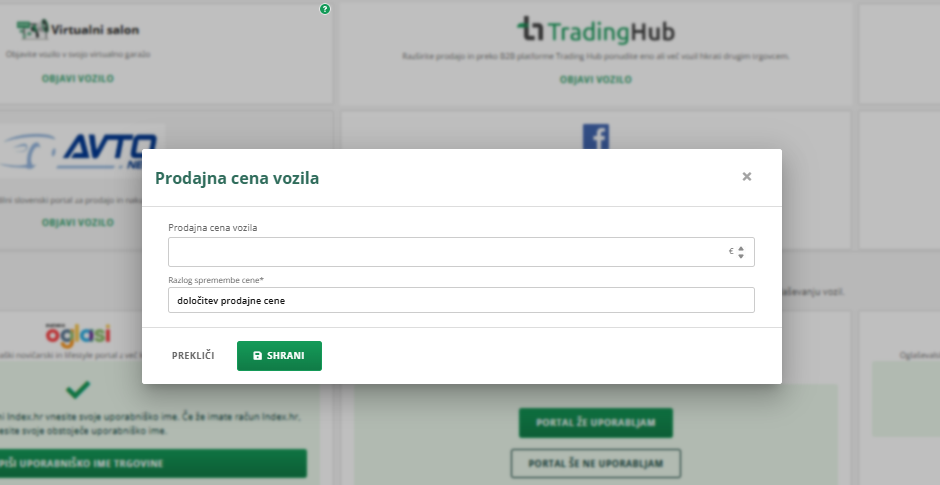 Ta cena bo upoštevana tudi na vseh novih oglasih, ki jih boš objavil. Če bi na različne portale rad vpisal različno ceno vozila, to lahko storiš.