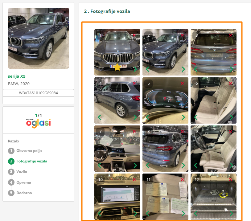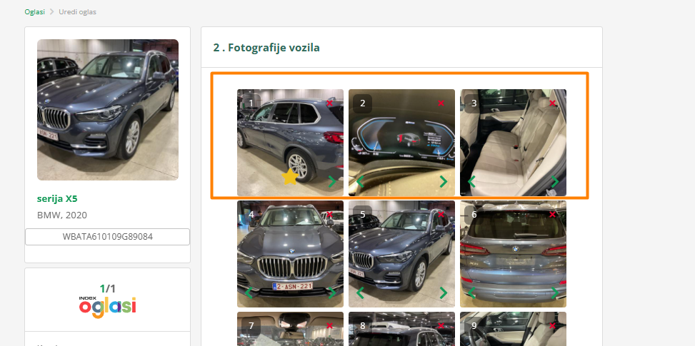 V obrazcu objave oglasa vozil je mogoče tudi spremeniti zaporedje fotografij, ki si jih nastavil na AutoBrief. Če bi rad spremenil zaporedje fotografij ali naslovne fotografije, potem sledi spodnjim navodilom.