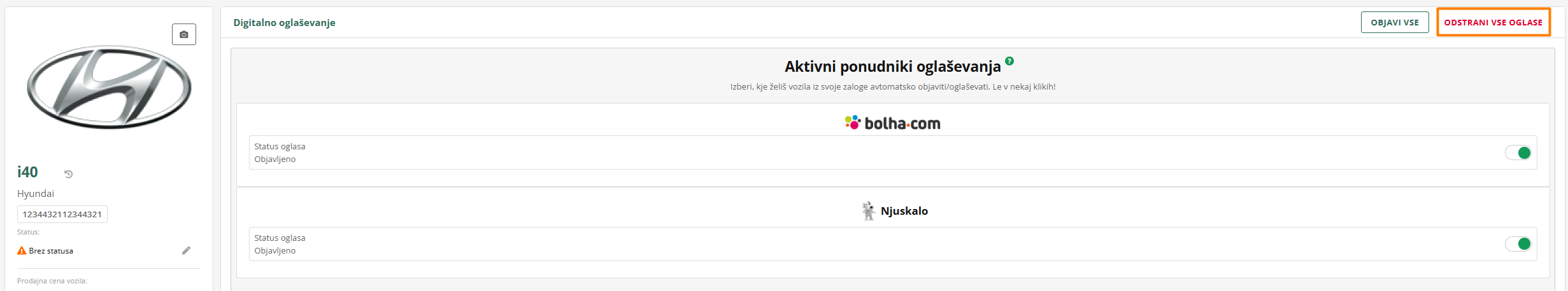 Naša platforma omogoča tudi možnost, da z enim gumbom odstraniš vse oglase ali objaviš vozilo še tja, kamor še ni objavljeno.