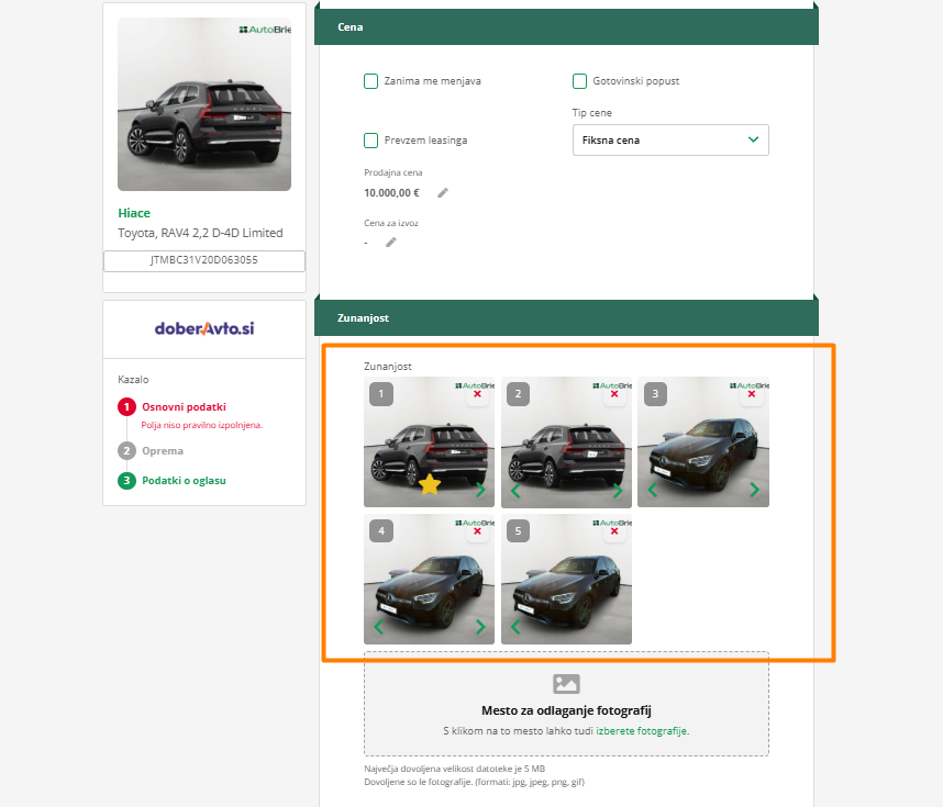 Enako kot za cene velja tudi za fotografije. Če boš fotografije pripel na vozilo, bodo te vključene tudi na vseh novih oglasih, ki jih boš objavil. Če bi na različne portale rad dal različne fotografije vozila, to lahko storiš po enakem postopku kot za ceno ali druge podatke.
