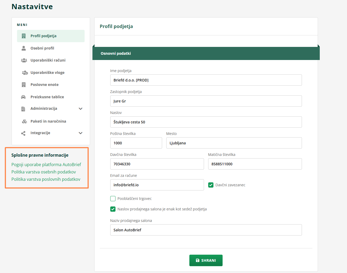 Vse relevantne pravne dokumente – Splošne pogoje uporabe, Politiko varovanja poslovnih podatkov in Politiko zasebnosti – najdeš na naši spletni strani https://autobrief.io/sl/ ali znotraj platforme, če klikneš na Nastavitve in nato pod menijem vidiš Splošne pravne informacije.